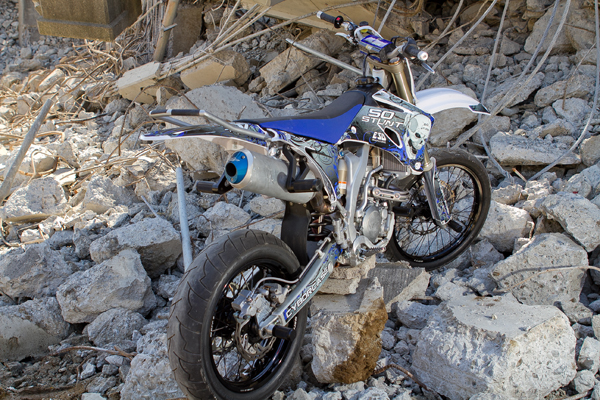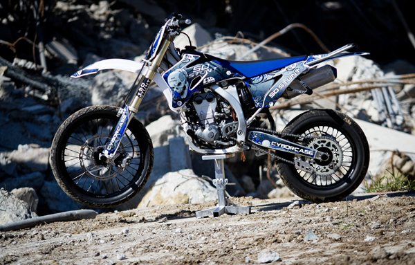The last thing I needed was some street rubber to really rip the city up. I have never like the 17 inch small wheels on a dirt bike, i personally think they look wak. my goals was to keep it lookin like the dirtbike that it is, so I wrapped some street tires on the stock wheels and tried it out. The front was good to go, but the rear did not circle good, the bike wanted to stand up and circle super wide and not lean in, even after experimenting with time pressure from 10-40 psi. It just didn’t work. My solution was to hit up Warp 9 Racing http://www.warp9racing.com/ and get a custom set of Supermoto Wheels goin.
